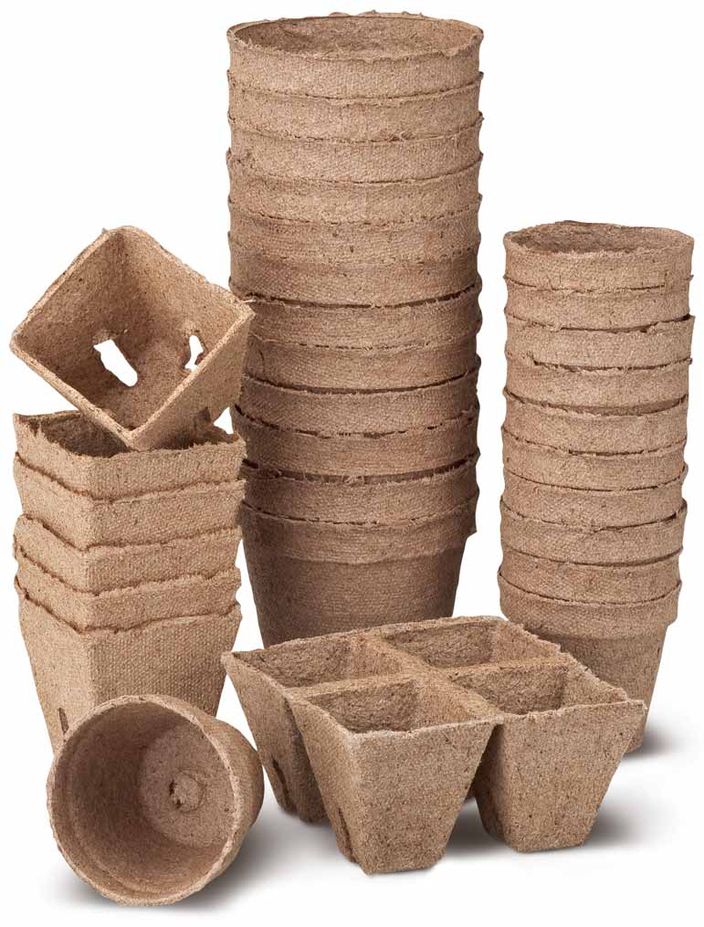 La majorité des Jiffy Pots sont 100 % compostables à domicile et autorisés en agriculture biologique. Les tailles des Jiffy Pots varient de 5,5 à 17 centimètres (rond) et de 4 à11 centimètres (carré).